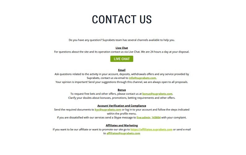 Suprabets support is of a very high standard. The fastest way to contact support is via live chat. Operators should be available 24/7 and if one of the operators is free at the moment, they will answer you within tens of seconds. In addition to English, you can also communicate in Spanish, Portuguese and French.